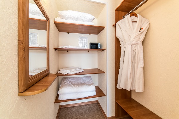 В номере: две или три односпальные кровати, прикроватные тумбы, шкаф, журнальный столик, телевизор, холодильник, чайный набор посуды, электрочайник